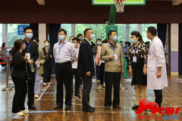 (记者 马铁泉)5月21日上午,以国家卫健委一级巡视员熊煌为组长的国务院疫苗督察组一行来校现场检查疫苗接种情况,副校长谢资清陪同检查。