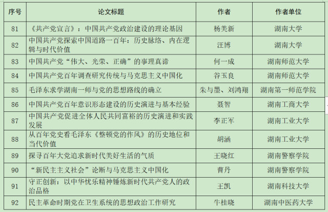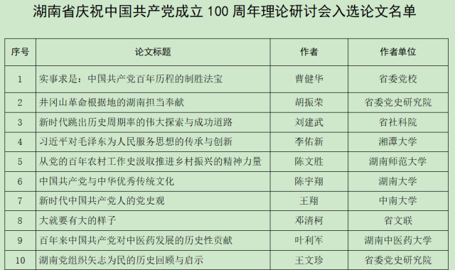 (通讯员 杨贤美)近日,湖南省委党史学习教育领导小组办公室、省委宣传部正式公布了湖南省庆祝中国共产党成立100周年理论研讨会入选论文,全省共100篇理论文章入选。其中,我校马克思主义学院陈文胜教授撰写的论文《从党的百年农村工作史汲取推进乡村振兴的精神力量》和公共管理学院何一成教授撰写的论文《中国共产党“伟大、光荣、正确”的事理真谛》、谷玉良博士撰写的论文《中国共产党百年调查研究传统与马克思主义中国化》榜上有名。我校是此次研讨会入选论文最多的省内普通高校之一。