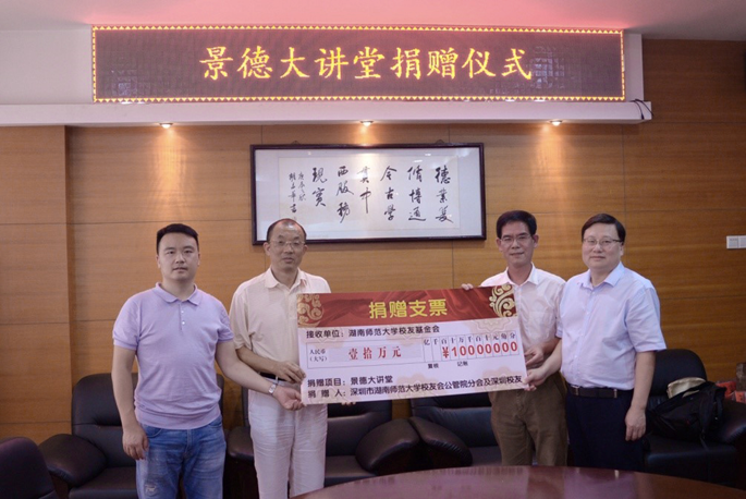 (供稿 校友总会)9月12日,我校深圳校友会执行会长兼秘书长邹寿长、公共管理学院校友王军代表深圳公共管理学院校友分会及部分深圳校友为母校捐资人民币拾万元,助力“景德大讲堂”建设。副校长王辉出席捐赠仪式。