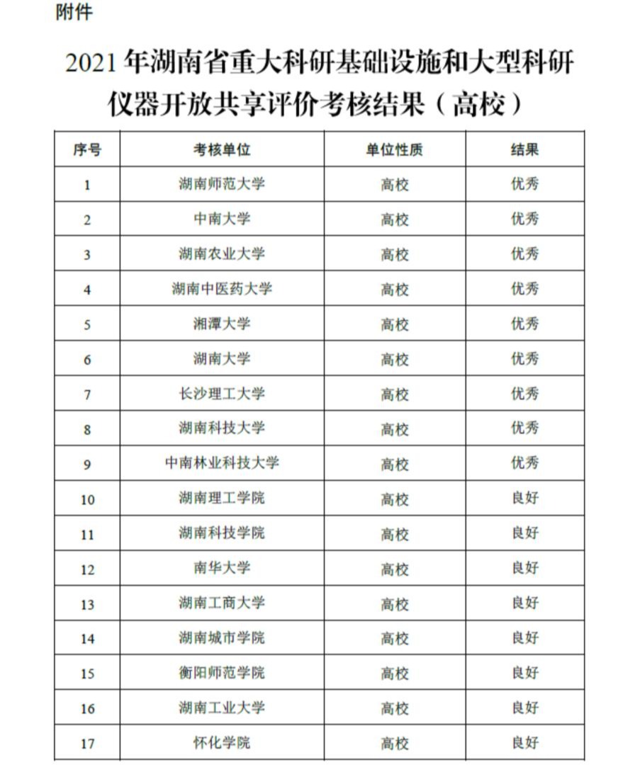 (供稿 资产与实验室管理处)近日,省科技厅、省财政厅、省教育厅联合发布2021年湖南省重大科研基础设施和大型科研仪器开放共享评价考核结果,我校获评全省高校第一名。这是湖南省第三年开展评价考核工作,我校已连续三年获评优秀并首次位居湖南省高校首位。