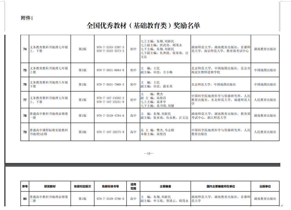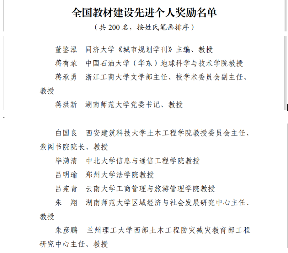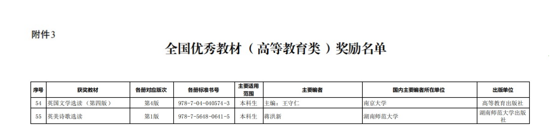 蒋洪新主编的《英美诗歌选读》荣获全国优秀教材高等教育类二等奖;朱翔作为第一主编编写,由湖南教育出版社出版的《义务教育教科书地理七年级上、下册》《普通高中教科书地理必修第一册》《普通高中教科书地理必修第二册》荣获全国优秀教材基础教育类二等奖。