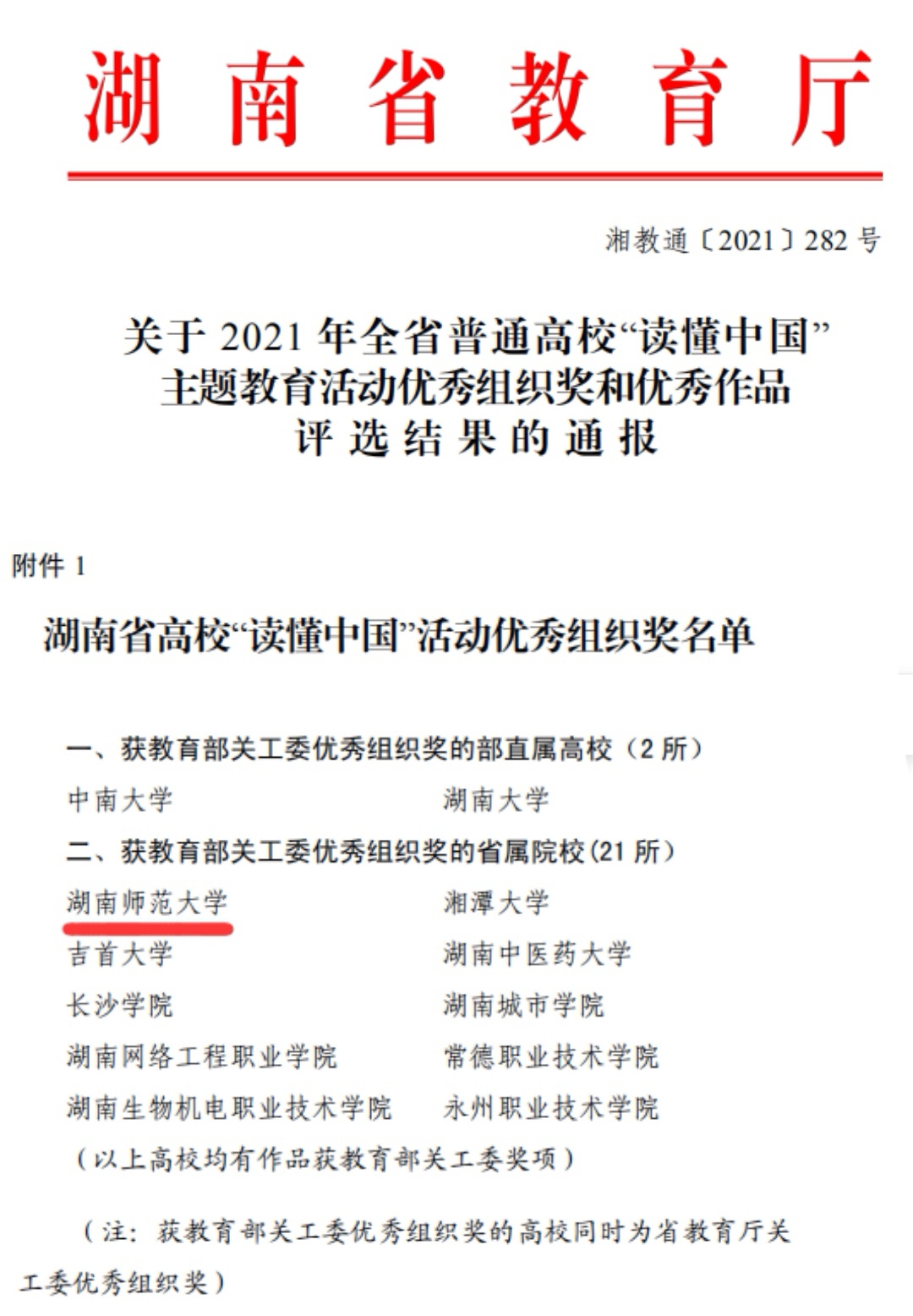 (供稿 关工委)近日,湖南省教育厅印发了《华体会平台2021年全省普通高校“读懂中国”主题教育活动优秀组织奖和优秀作品评选结果的通报》。我校关工委报送的征文类、微视频、短视频、舞台剧共12件作品获奖,其中征文一等奖4篇,二等奖4篇,微视频一等奖1部,短视频一等奖1部、二等奖1部,舞台剧一等奖1部,获奖等级及数量均居全省高校第一,并再次获得教育部关工委和省教育厅“读懂中国”活动优秀组织奖。