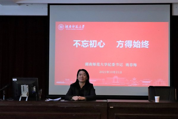 (通讯员 曹慧娟 黄思颖 郭校语)10月21日下午,校纪委书记姚春梅在数学与统计学院309报告厅为该院师生党员作“不忘初心,方得始终”主题报告。报告会由数学与统计学院党委书记颜中玉主持。