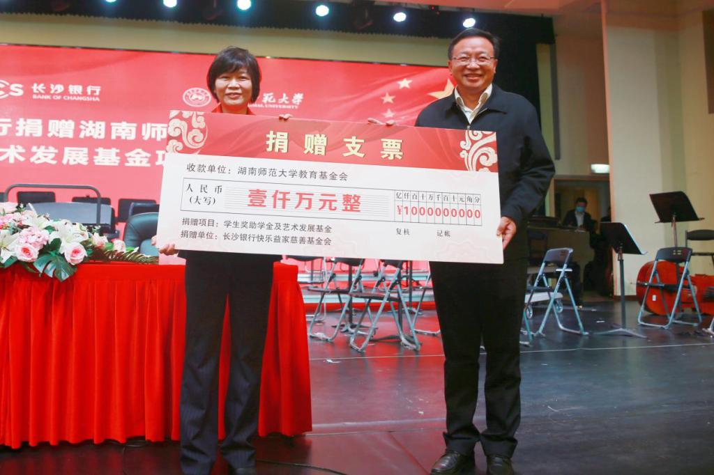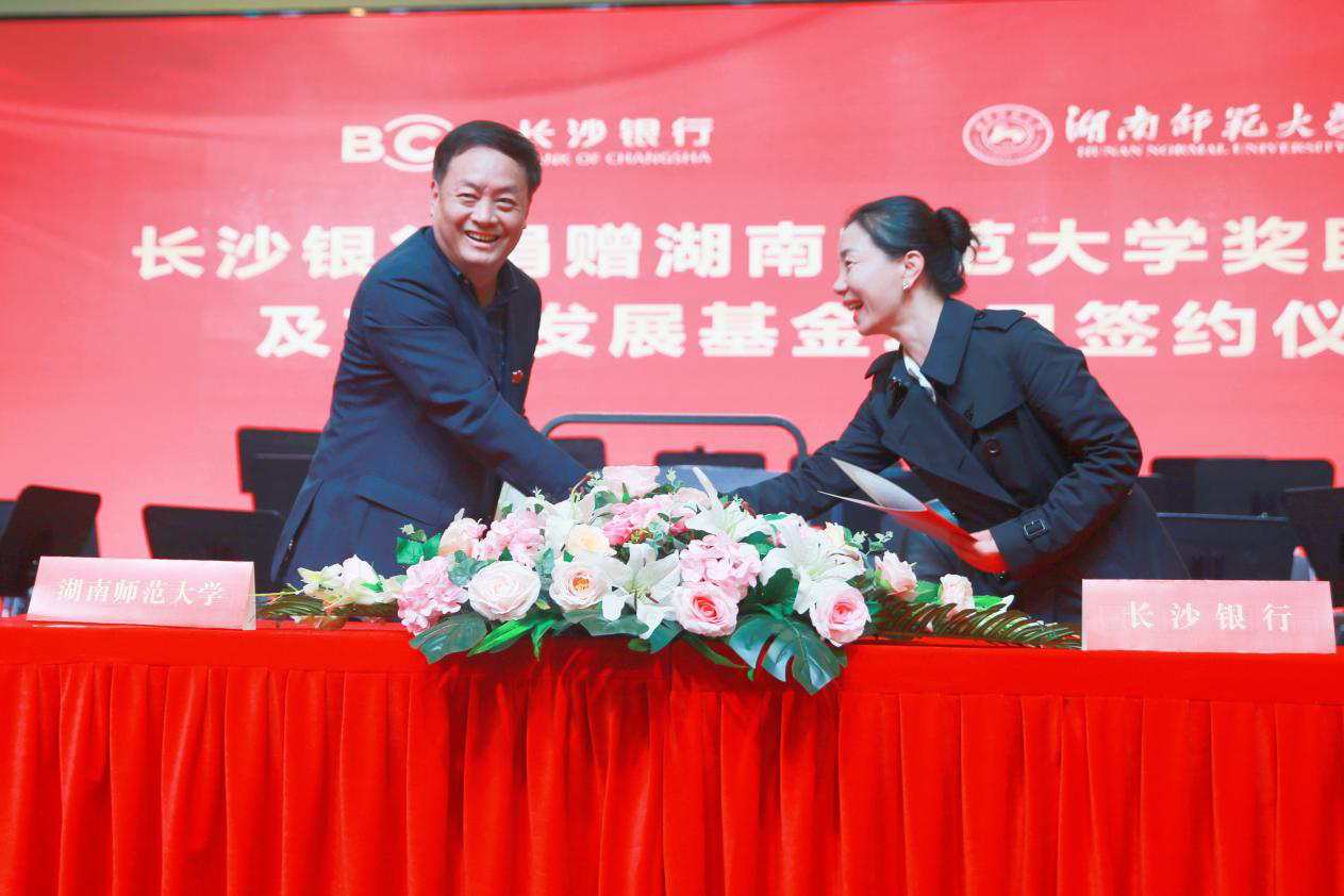 (供稿 校友总会)10月24日,在建校83周年校庆日到来前夕,长沙银行奖助学金及艺术发展基金捐赠项目签约仪式于我校音乐学院和乐楼四楼大音乐厅举行。长沙银行捐款1000万元人民币,设立华体会平台奖助学金及艺术发展基金项目。湖南省政协原副主席谭仲池,长沙银行党委副书记、行长赵小中,长沙银行工会主席、快乐益家慈善基金会理事长李建英,长沙银行工会副主席李晓蓉,我校校长刘起军,副校长刘怀德、王辉出席签约仪式。捐赠仪式由我校校友总会·教育基金会秘书长梁勇主持。