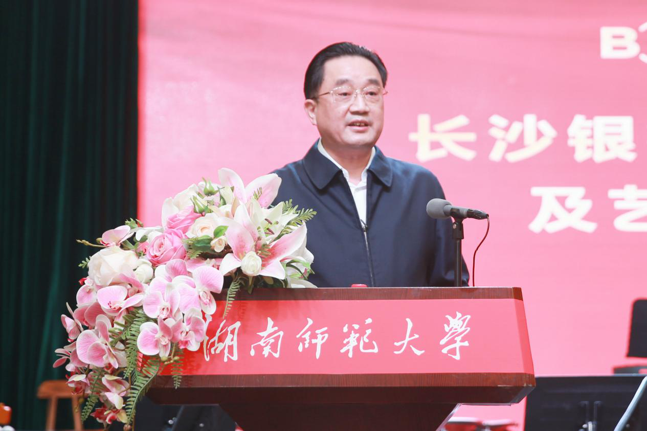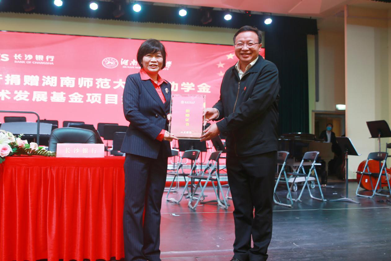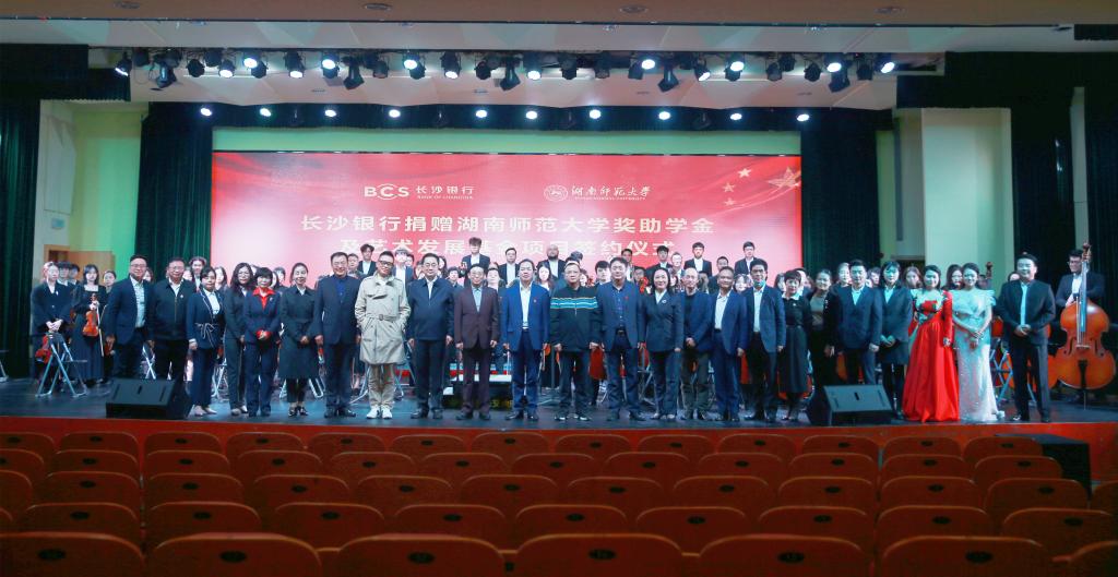 长沙市直机关工委副书记胡金文,长沙银行总行营业部主任陈富华、副主任曹莉娜,长沙银行快乐益家慈善基金会秘书长文谦,长沙银行总行营业部公司部总经理欧阳钊、客户经理郭懿霄,校友企业家联盟理事长王毅清、副理事长肖沛宇,执行秘书长易学尧,我校相关单位负责人以及受到资助师生代表200余人参加了捐赠仪式和观看了演出。