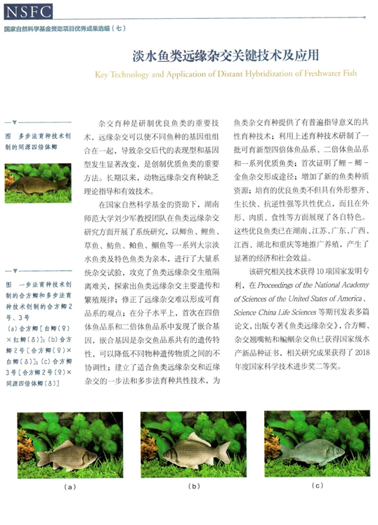 近日,国家自然科学基金委员会在成立三十五周年之际,遴选了2016-2020年国家自然科学基金资助项目的部分优秀成果,编辑出版了《国家自然科学基金资助项目优秀成果选编(七)》,我校刘少军院士主持承担的国家自然科学基金项目支撑取得的“淡水鱼类远缘杂交关键技术及应用”成果入选。该成果是水产领域唯一入选《国家自然科学基金资助项目优秀成果选编(七)》的优秀成果,体现了该研究成果在我国水产种业发展中的领先性和重要性。