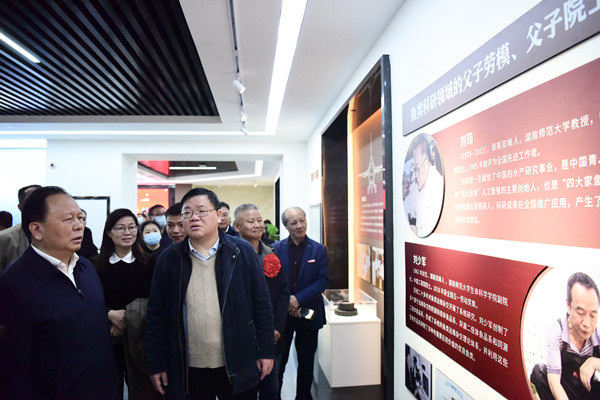 湖湘劳模工匠馆是湖南省首个也是目前唯一一个大型劳模工匠主题展馆,以实物、事迹、图像、视频和音频等方式对新中国成立以来我省近100位劳动模范与工匠、劳模集体的奋斗故事和感人事迹进行了立体化展示。刘筠、刘少军这对父子劳模、父子院士的先进事迹醒目展示在科技创新板块,我校工会常务副主席余英向周农、徐文龙等观展领导详细介绍了两位劳模院士的科研经历与突出贡献。刘筠、刘少军两位院士在科研岗位几十年如一日的坚守与奋斗,展示了一代代师大人初心不变的传承与创新,生动诠释了师大仁爱精勤的校训精神,他们的先进事迹书写了伟大的劳动故事,更为经济社会发展汇聚了强大的正能量。