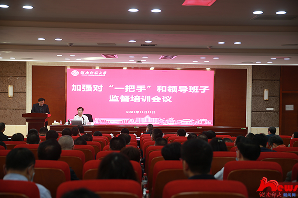 (记者 邓圣曦 廖子璇 刘姣 丁美玲)11月11至12日,学校在中和楼342报告厅召开加强对“一把手”和领导班子监督培训会议。省纪委监委驻省教育厅纪检监察组组长曹世凯,学校校长刘起军、党委副书记周俊武、副校长唐贤清、党委委员沈又红、段巍出席会议。校党委书记蒋洪新、纪委书记姚春梅主持会议。