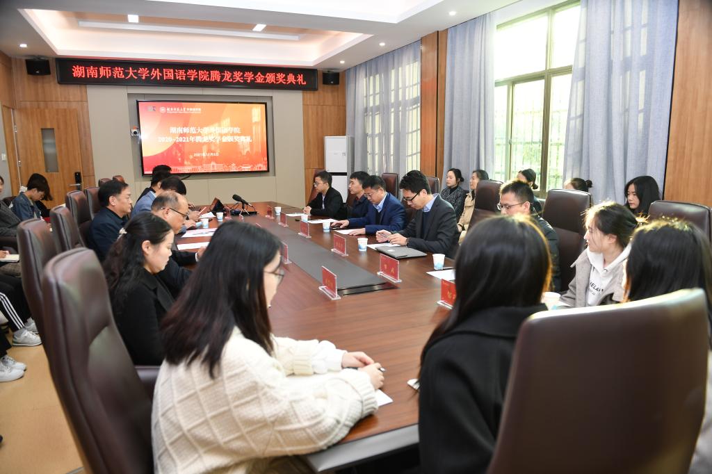 (记者 傅欣怡 余秋雁 通讯员 张元强)12月5日,我校外国语学院举办腾龙奖学金颁奖典礼。广州腾龙健康实业股份有限公司董事长彭学文、总经理黄震宇,我校副校长王辉出席仪式。典礼由外国语学院学工办主任张元强主持。