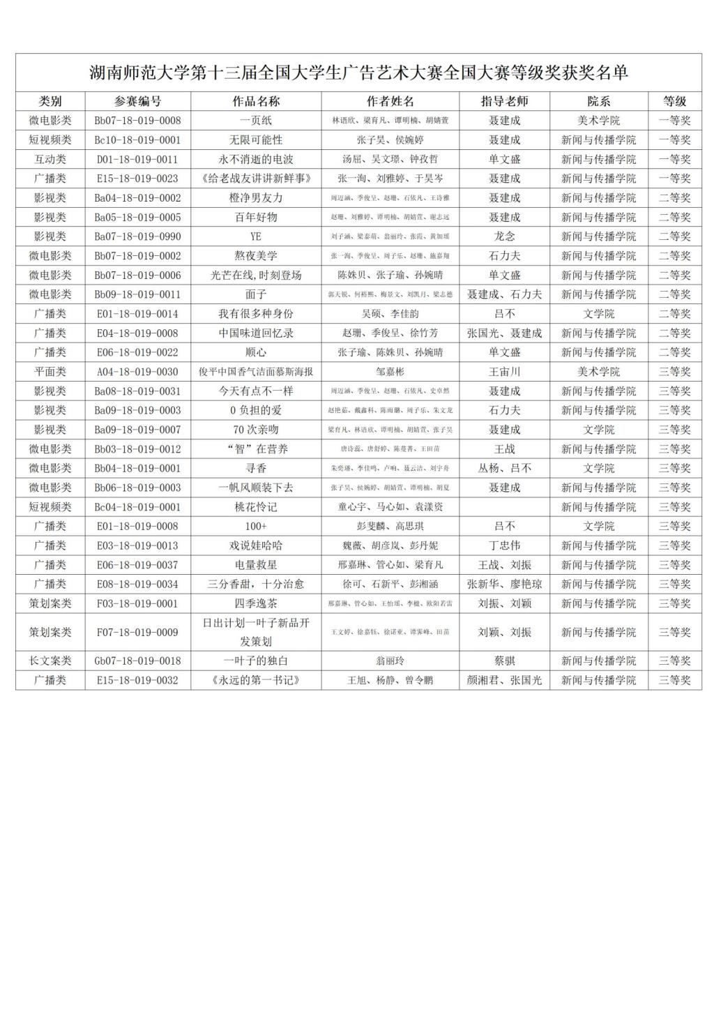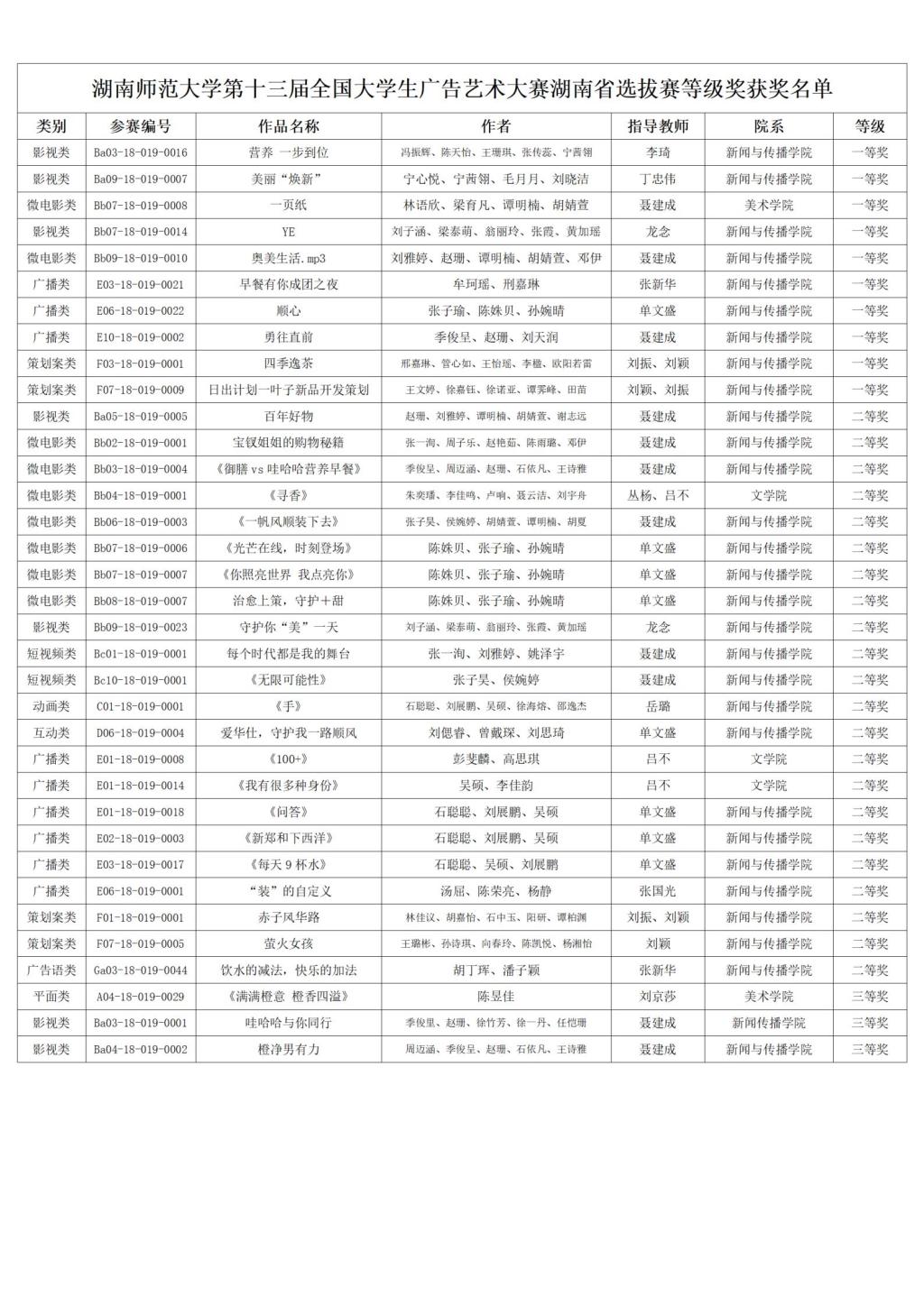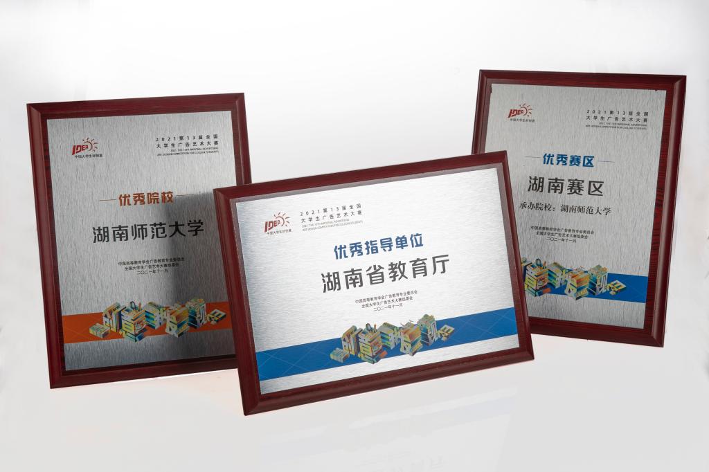 (通讯员 靳盼)近日,第十三届全国大学生广告艺术大赛评选活动在京圆满落幕,本届全国评选中我校获全国奖48项,囊括全国一等奖4项、二等奖9项、三等奖16项,并再次荣膺全国“优秀院校”称号。此外,我校还在湖南赛区评选中斩获省级奖97项,其中省一等奖10项、二等奖22项。