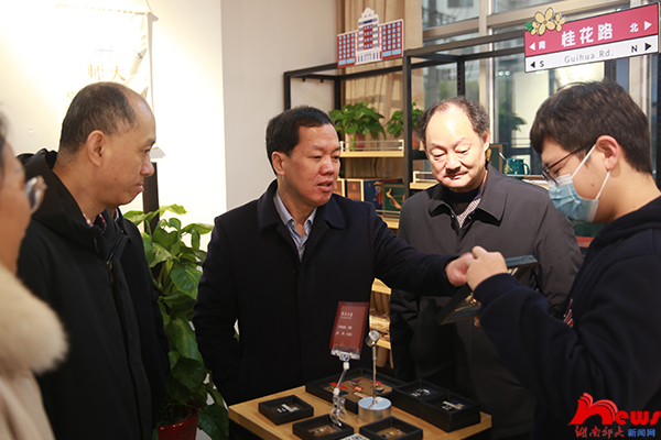 刘起军一行先后调研了师大文创馆、湖南师大知识产权有限公司、创业孵化基地等地,听取了相关单位负责人的工作汇报。刘起军对桃子湖文化创意产业园的发展情况给予充分肯定,同时提出三点希望:一是希望创业园能更加重视培养师生的创新创造意识,提升师生的创新创造能力,为锻炼师生创新创业本领提供平台;二是希望打造校园文化品牌,擦亮师大文创等展示学校文化的窗口,为校园文化繁荣发展增色添彩;三是希望创业园能作为一个“练兵场”,不断提升师生的知识产权意识,提升学校知识产权工作水平,推动学校科技成果转化。