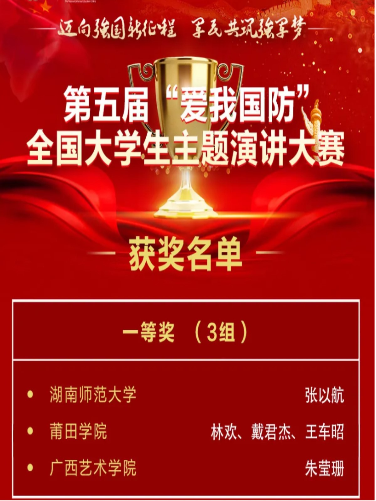 (供稿 学生工作部)近日,第五届“爱我国防”全国大学生主题演讲比赛评审结果正式公布,我校新闻与传播学院2020级播音与主持专业学生张以航从来自全国各高校的近万名选手中脱颖而出,荣获大赛一等奖。国际汉语文化学院演讲与口才教研室主任周炯老师获评“优秀指导老师”称号。