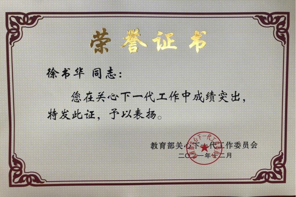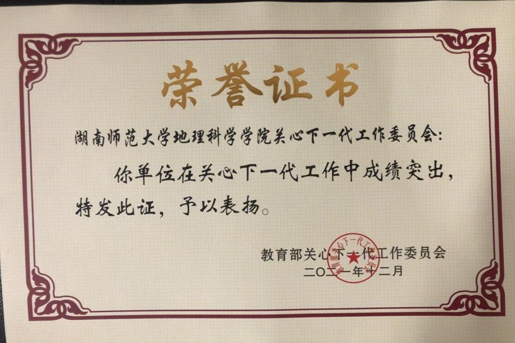 我校地理科学学院关心下一代工作委员被评为全国教育系统关心下一代工作“先进集体”。校关工委常务副主任徐书华同志被评为全国教育系统关心下一代工作“先进个人”。