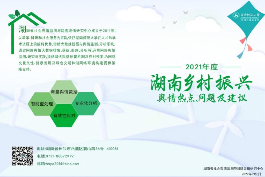 (通讯员 段峰峰)近日,湖南省社会舆情监测与网络舆情研究中心联合我校网络与新媒体系、内参研究中心根据2021年度湖南省乡村振兴网络舆情数据的分析,共同完成了《2021年度湖南乡村振兴舆情分析报告》,并在此基础上形成并发布了《2021年度湖南乡村振兴舆情热点、问题及建议》,不仅为洞悉我省乡村振兴舆情信息及舆情应对提供了参考,同时也为党和政府开展乡村振兴工作提供了策略支持。