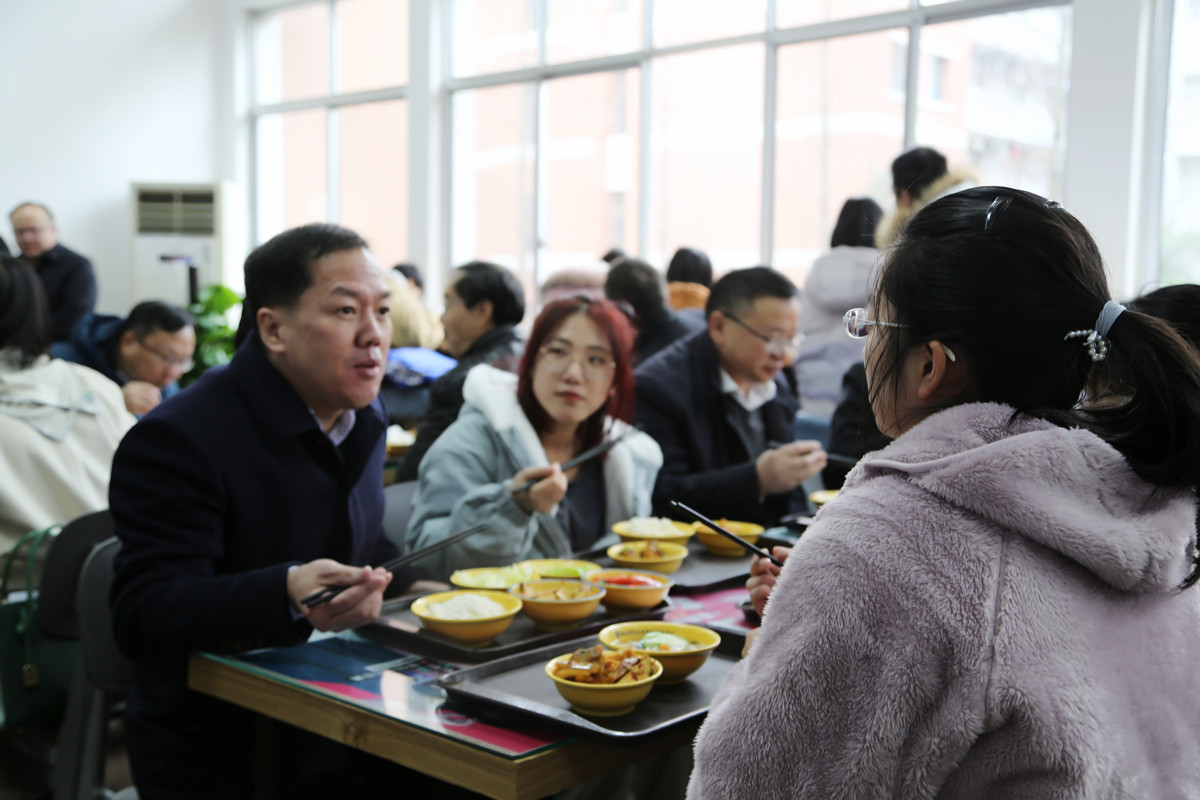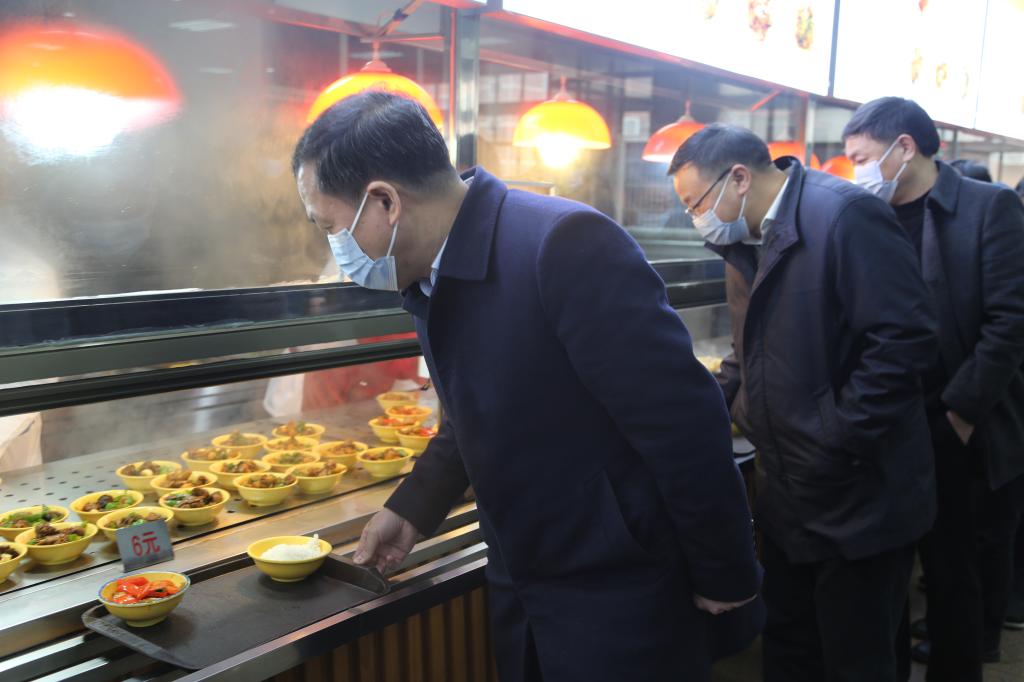 刘起军一行考察了食堂餐饮基本情况,并听取了相关负责人的工作汇报。正值午餐时间,刘起军一行与学生共进午餐,询问了学生的寒假生活、返校行程以及对食堂饮食的相关意见。他指出,相关部门要谨守安全规范、加强防疫意识、重视餐饮安全,同时要不断提升餐饮质量,保证学生营养摄入,为学生提供温馨可靠的校园服务。