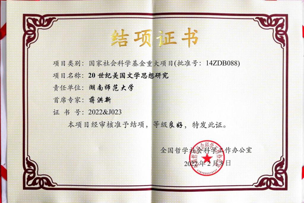 国家社科基金重大项目《20世纪美国文学思想研究》(14ZDB088)于2014年11月立项以来,项目组在首席专家蒋洪新教授的带领和指导下,积极推进,深入研究,取得了一系列丰富的阶段性研究成果,在《外国文学研究》《外国文学评论》《外语学刊》《当代外国文学》等刊物发表论文50多篇,多项研究成果被中国人民大学复印资料转载。阶段性研究成果获评教育部高等学校科学研究优秀成果奖(人文社会科学)二等奖1项、湖南省哲学社会科学优秀成果一等奖2项,蒋洪新的著作《T.S.艾略特文学思想研究》入选2019年度国家哲学社会科学成果文库。