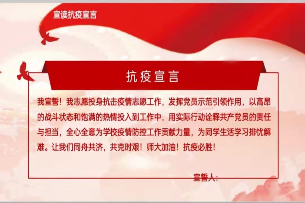 为发扬党员的先锋模范带头作用,夏禹老师于3月30日策划并组织了线下、线上同步的党员宣誓活动,带领同学们为学校的防疫工作贡献了自己的一份力量。