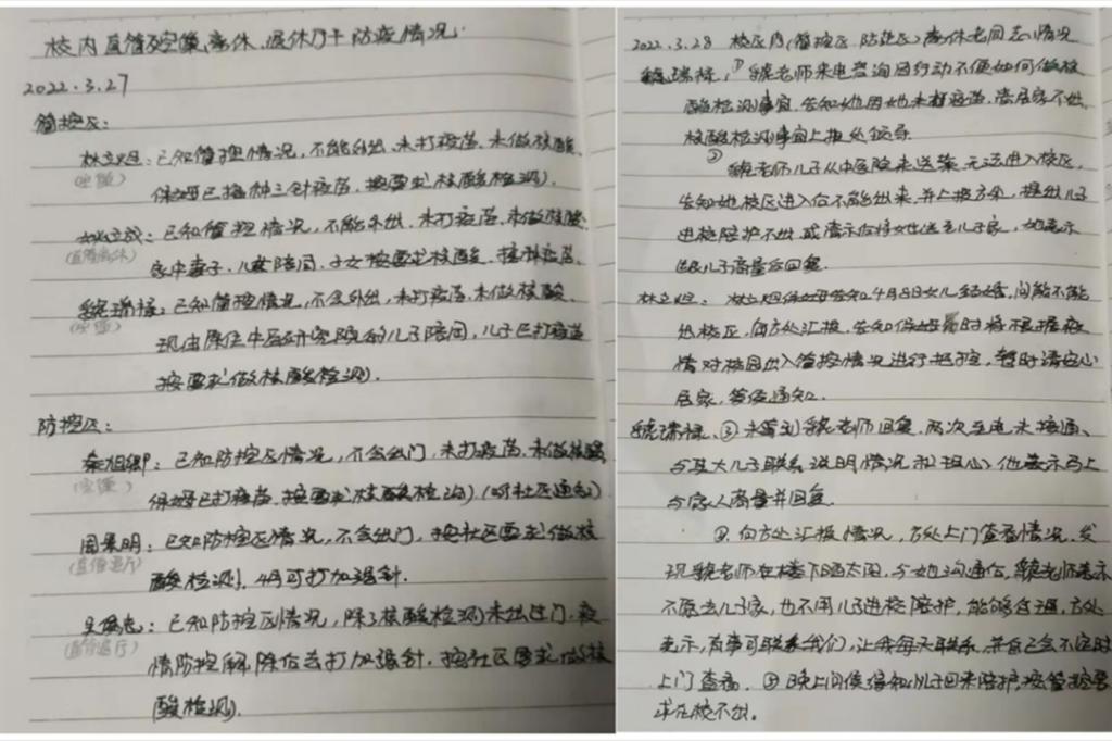 任纷的丈夫是一位社区工作者。疫情当前,他的工作急、任务重,早出晚归已是常态,甚至凌晨电话就不断响起。小孩也因疫情居家上网课,照顾家庭的责任便担在她一个人的身上。这段时间,她每天都给在校内的离休干部和退休厅干打电话联系,了解他们的生活起居,记录电话内容的本子都详细记录,一字一字无不在体现着她对老同志们服务的用心。