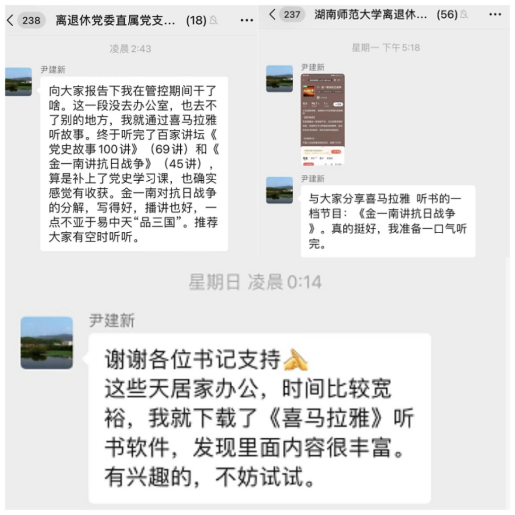 离退休党委书记尹建新勉励党员同志利用听书软件居家学习,推动党史学习教育常态化长效化,并对百家讲坛《党史故事100讲》《金一南讲抗日战争》做了特别推介。