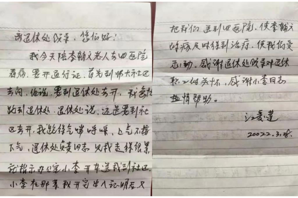 “我们深受感动,感谢退休处领导对退休职工的关怀,感谢小李同志的热情帮助。”小李同志,是离退休工作处行政办公室主任李成。这天,是管控的第三日,离退休工作处疫情应急处置小组第三次召开了会议,王齐、尹建新、周青、方俊雄等人到会,讨论划入管控区后离退休老同志的防疫和生活就医事项。江老师就在这天写下了一封简短而发自内心的感谢信。