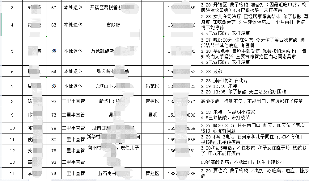 疫苗接种是疫情防控常态化下的长期工作。离退休工作处也一直将接种疫苗作为一项重要工作推进,建立起了完整完善的疫苗接种台账,掌握了接种情况和个人接种进程。除负责本单位退休同志,离退休工作处还直管了89名老同志。他们的原所在单位经合并调整后已不存在,故被学校统一安排到离退休工作处直接管理。这批老同志居住分散,互相之间联系并不紧密,且多数年岁已高,平均年龄达到了79.6岁,80岁以上的占比过半,年龄最高的达到96岁。在未接种疫苗的人中,患病、行动不便因素占比超过75%。高龄、患病、丧失行动能力、意识不清……诸多因素成为了推进工作的难点。