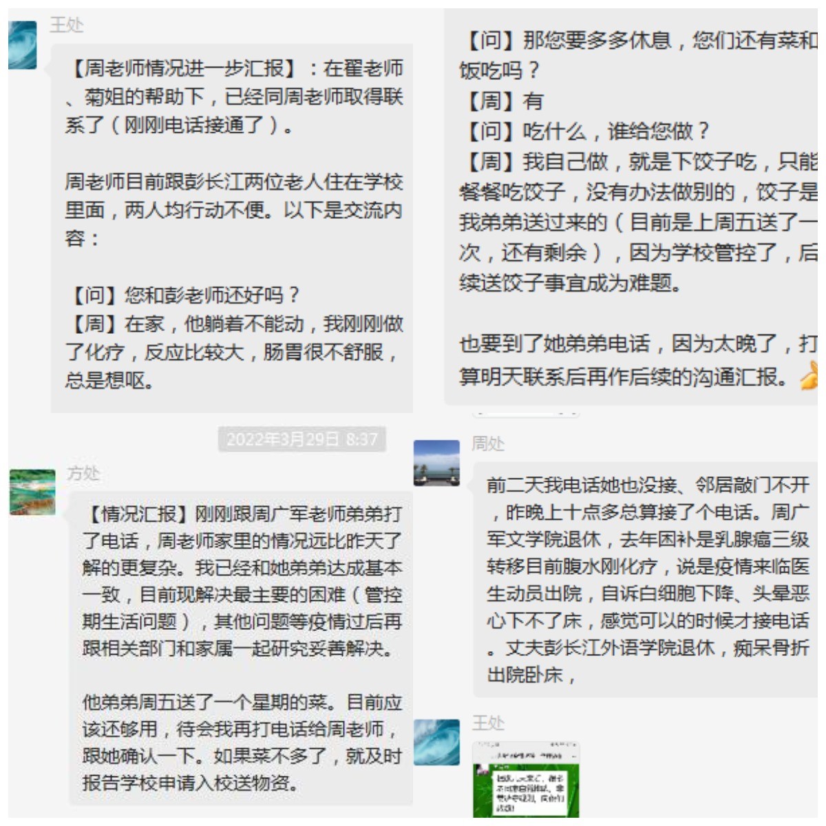 周老师身患癌症正在化疗期,管控前一日从医院出院回家。她的丈夫彭教授则是患有阿尔茨海默症,并因骨折卧病在床。两人的孩子又被管控在上海,家中除了两个患病老人再无旁人。收到消息后,离退休工作处与夫妇二人取得了联系,两人均行动不便,周老师因化疗反应较大,有肠胃不适、恶性呕吐的症状,更令人感到担忧的是生活物资储备不足,只有剩余的一点冷冻饺子可供餐食。
