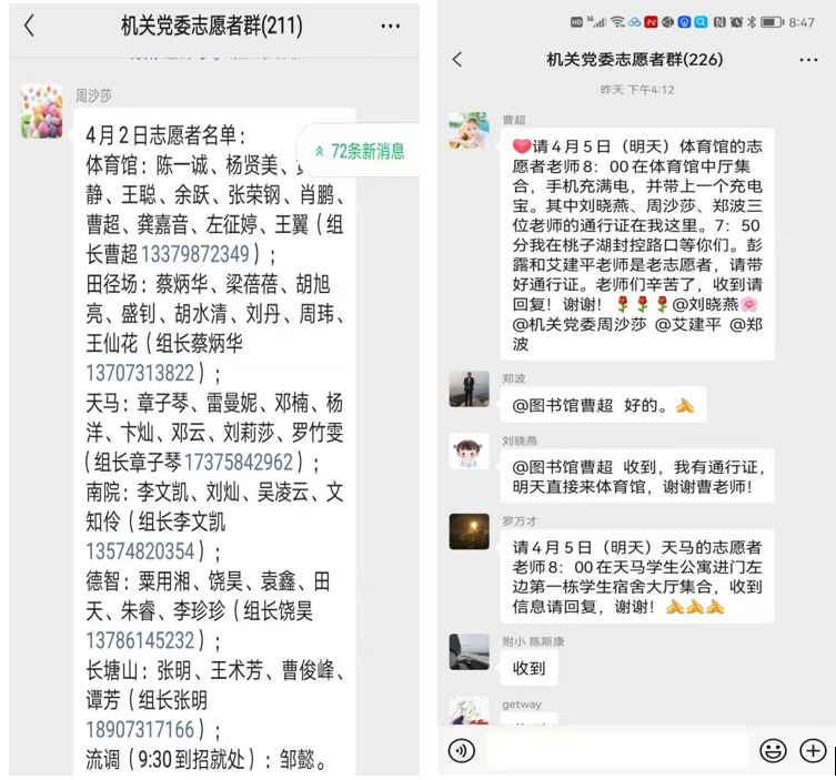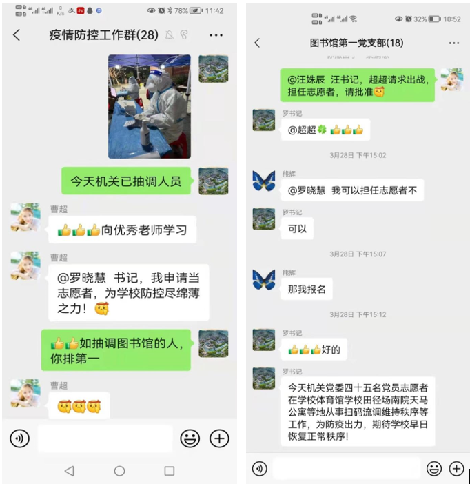 当曹超在图书馆疫情防控工作群看到学校机关处室党员志愿者工作照片时,心中一种强烈的使命感油然而生,“我是一名共产党员,面对这突如其来的疫情,必须挺身而出,到疫情防控第一线去,到需要我的地方去!”并立马主动请缨,希望能为学校抗疫贡献自己的力量。3月28日下午,图书馆党总支发出志愿者征集通知时,曹超第一个报名。