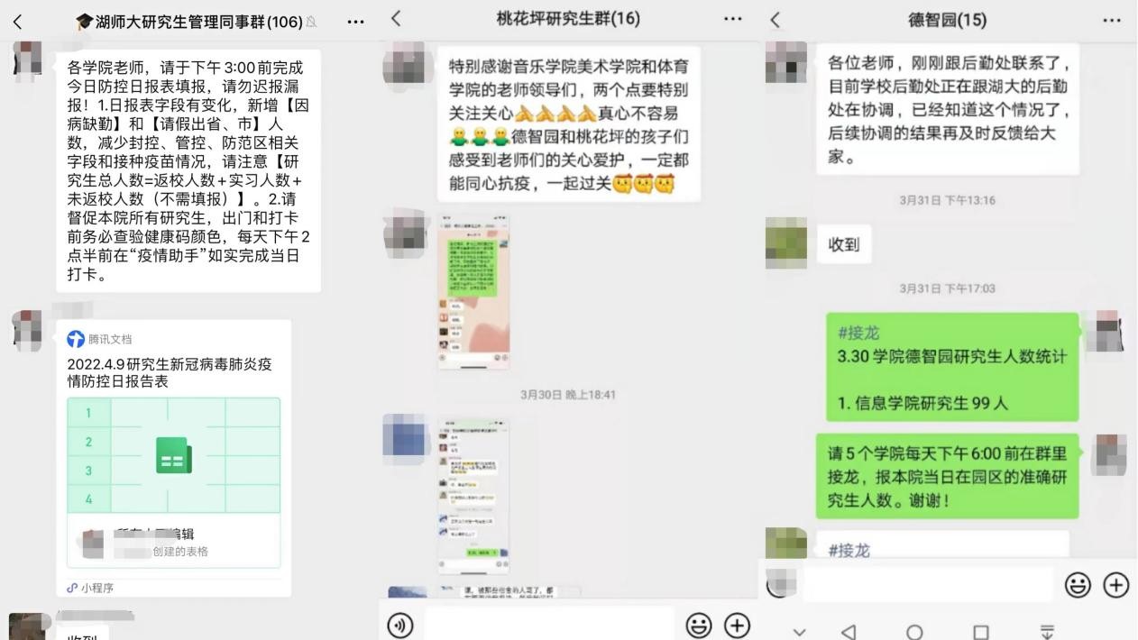 一区一策,不同区域分类管理将防控工作做实做细。3月26日起,二里半校区被划分为管控区,德智园宿舍区与湖大校区一起被管控,咸嘉湖校区实施封闭管理,3月29日起桃花坪宿舍区实施封闭管理。针对不同区域的不同情况,学校研工系统及时摸清底数,组建了不同区域的工作群,一区一策,在核酸检测、餐饮保障、学生就医等方面,实施分类管理服务。同时,在信息化办的支持下,启动了研究生“疫情助手”小程序,每天校内外9000多名研究生通过小程序完成健康打卡,一人一台账,将“日报告、零报告”制度落到实处。