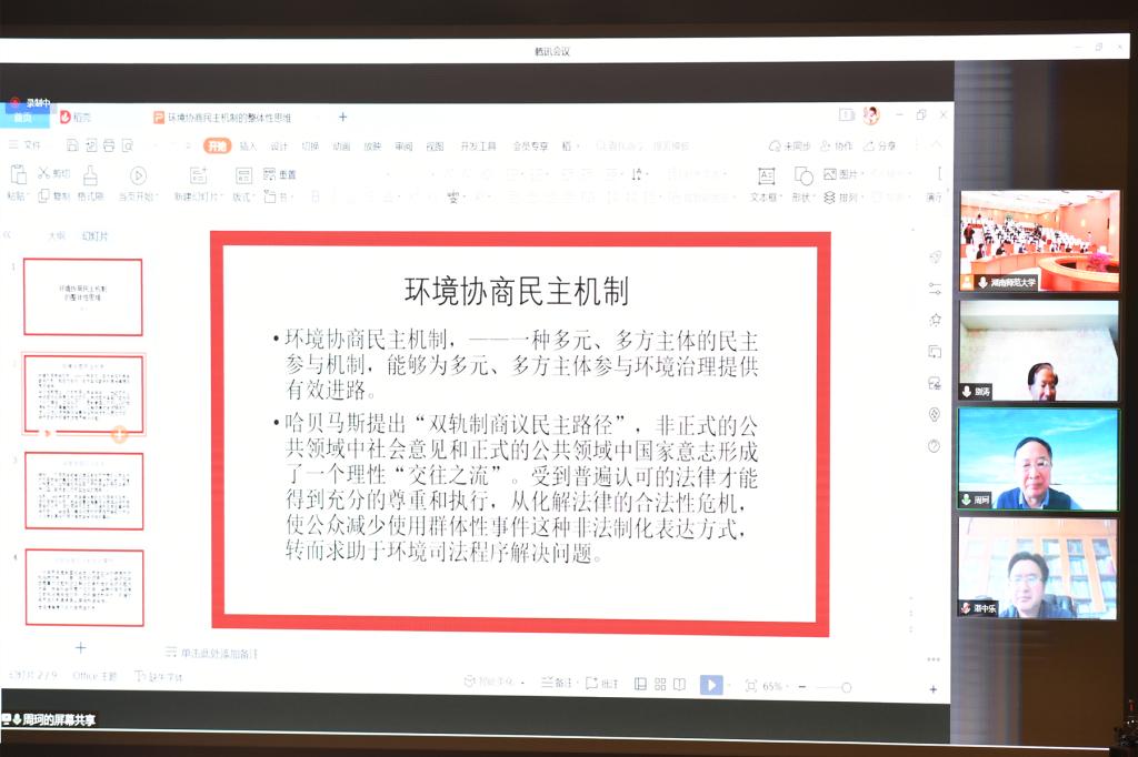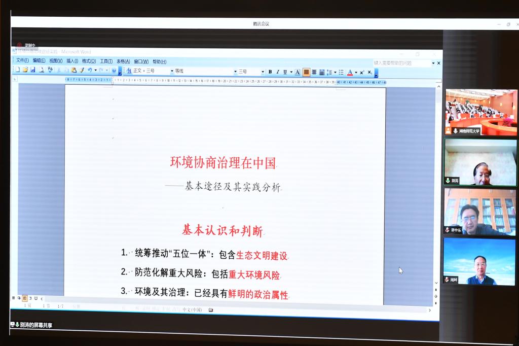 随后,7位专家分别进行主题报告。生态环境部法规与标准司别涛司长的《环境协商治理在中国——基本途径及其实证分析》,中国法学会环境资源法学研究会副会长、中国人民大学法学院、湖南大学法学院周珂教授的《环境协商治理的整体性思维》,中国法学会行政法学研究会副会长、中国法学立法学研究会副会长、北京大学法学院湛中乐教授的《生态环境治理中的协商与合作》,我校生态文明研究院院长刘湘溶教授的《华体会平台环境协商治理的“一点体会 三点看法”》,湖南省政协研究室唐宇文主任的《环境协商治理的湖南实践》,中南林业科技大学校长、湖南专业特色智库——湖南绿色发展研究院院长廖小平教授的《环境协商治理的三个理论问题》,湖南省委宣传部社科规划办陈湘文主任的《积极发挥智库在环境协商治理中的重要作用》等报告依次围绕“全过程民主视域下的环境协商治理”的核心与理论前沿问题进行了分享与探讨。