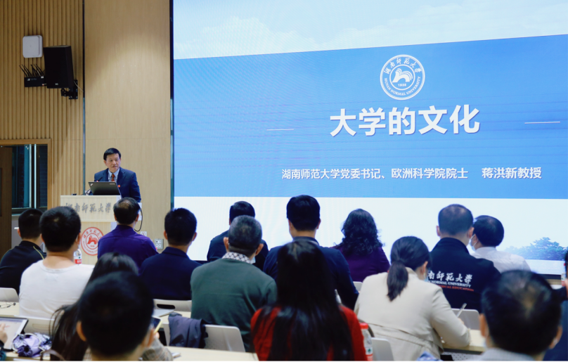 蒋洪新以在牛津大学、巴黎大学、博洛尼亚大学、柏林大学等世界知名大学的见闻为例,从何为大学文化,大学文化何为两个方面进行了深入阐述。他介绍了加州大学前校长Clark Kerr的观点,即大学基业要保持长青要有忠实的客户和品牌、持续的核心理念、为核心奋斗的师资团队、不断反思创新的组织等要素。他指出,中国大学文化源渊远流长,大学文化是大学核心竞争力所在,另一方面增强大学文化建设有利于提升大学文化实力、大学领导力建设。大学也应是一个共同体,教师与学生,学生与学生应该有充分的交流,保持和谐友爱的关系。