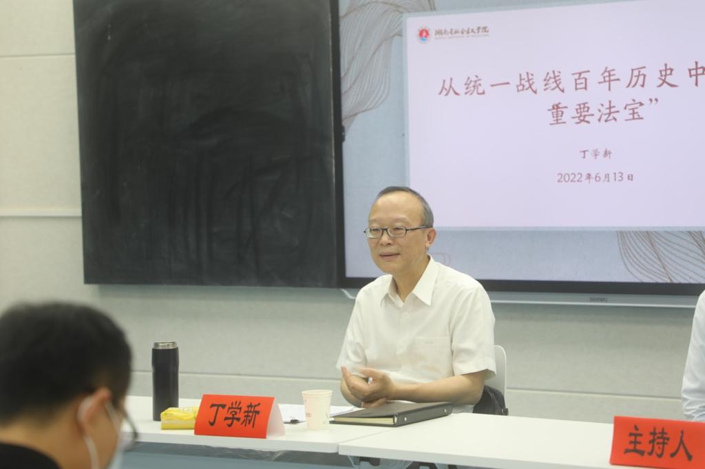 (供稿 党委统战部)6月13日下午,省委统战部副部长、省社会主义学院党组书记丁学新应邀来我校作题为《从统一战线百年历史中感悟“重要法宝”》的学术讲座。讲座由民盟湖南省委会副主委、公共管理学院教授杨君武主持。