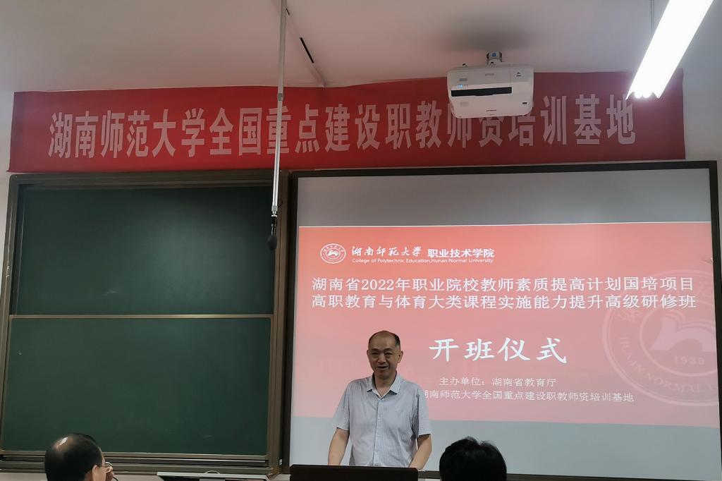 (通讯员 曾锦意)6月19日上午,湖南省2022年职业院校教师素质提高计划国培项目高职教育与体育大类课程实施能力提升高级研修班开班仪式在我校全国重点建设职教师资培训基地举行,副校长杨震出席仪式。仪式由职业技术学院党委书记黄丽萍主持。