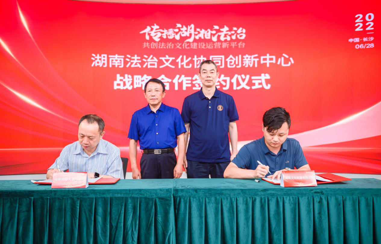 龚定名表示,为深入贯彻习近平法治思想,进一步弘扬社会主义法治精神,推动法治湖南建设,在湖南省委宣传部的关心指导下,湖南日报社与我校战略携手,共同打造湖南省首家法治文化建设跨界运营创新平台。双方本着“平等互利、资源互补、平台共享”原则,发挥各自优势,全方位整合法治教育资源、融媒体传播资源、专家智库资源、文化创意资源,建立跨领域的高效协同运作机制,打通普法内容全方位推广执行难题中的“最后一公里”,助力各企事业单位、社区、学校、乡村等高效推进法治文明建设,助推湖湘法治文化建设实现新跨越、迈上新台阶。