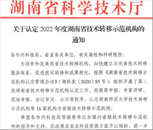 (供稿 科技处)近日,从省科技厅传来喜讯,根据《华体会平台认定2022年度湖南省技术转移示范机构的通知》,我校获批2022年度湖南省技术转移示范机构认定。
