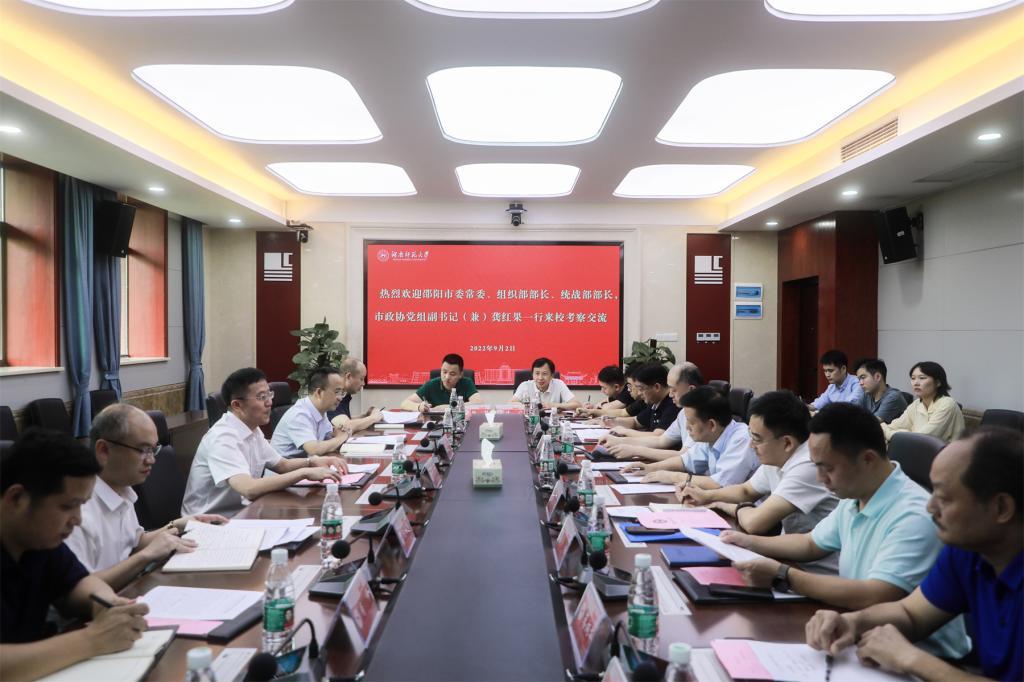 蒋洪新对龚红果一行的到来表示热烈欢迎。他表示,学校与邵阳市合作源远流长。相信在双方已有的合作基础上,会开拓更广阔的空间,结出更丰硕的成果。他强调,要在未来延续深厚情谊,创新合作机制,充分发挥校市合作优势,加强校企联动,在产学研融合、人才培养、乡村振兴等方面开展多层次全方位合作,推动双方各项事业再上新台阶,为全面落实湖南省“三高四新”战略定位和使命任务贡献力量。