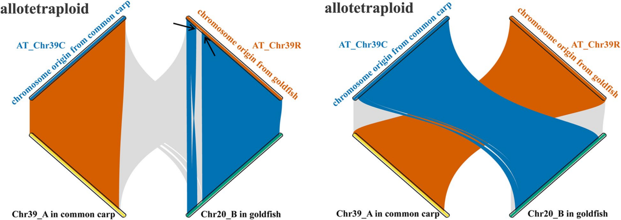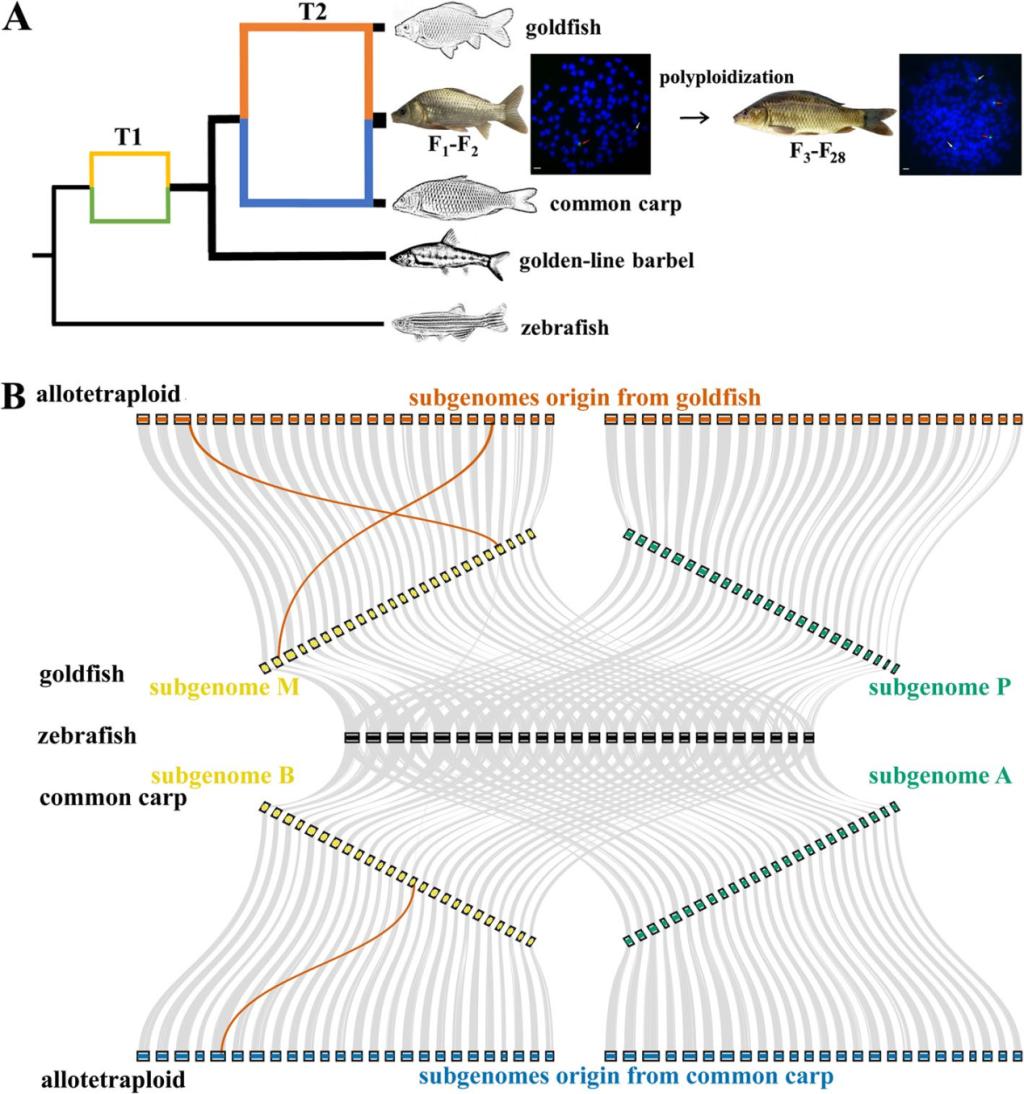图1.两轮额外的异源多倍化事件促使异源四倍体鲫鲤品系形成