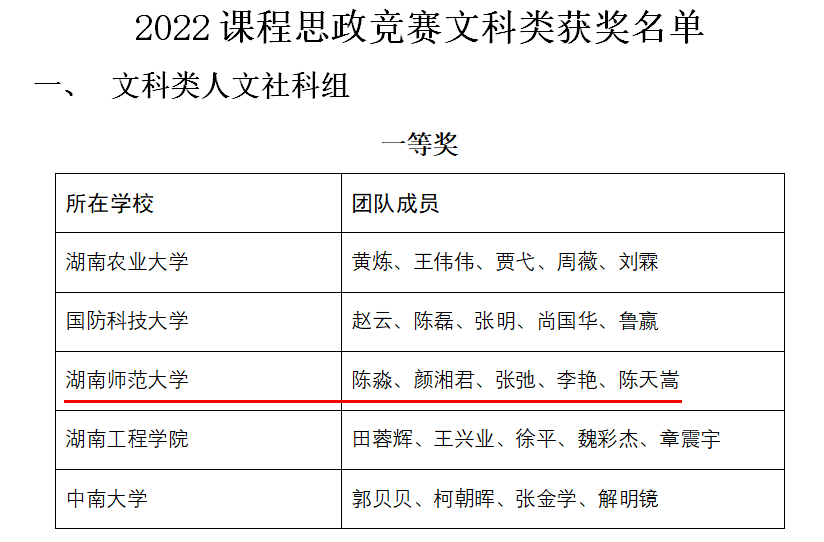 据悉,本次比赛由湖南省教育厅主办,由湖南第一师范学院与高等教育出版社协办。自今年3月启动以来,来自全省的181个团队晋级决赛。现场决赛分文科类、理工(医学)类、外语类三大类别七个组别进行,参赛教师需在20分钟内完成说课、课堂教学展示和现场问答三个环节。经过专家评审,最终共有27支队伍获得一等奖,其中,人文社科类获奖团队仅有5支,陈淼老师及教学团队位列其中。