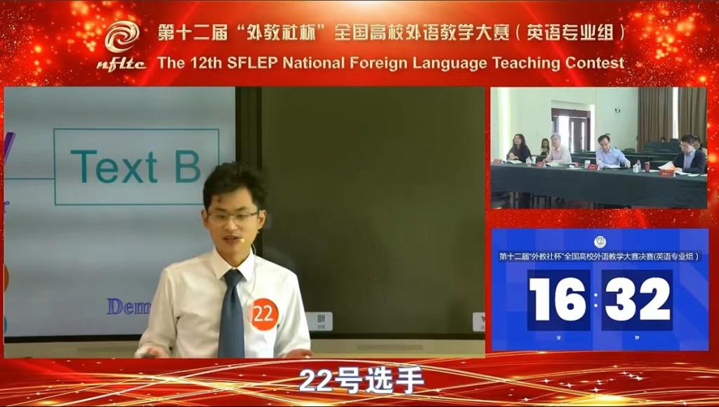 (供稿 外国语学院)2022年9月23-25日,第十二届“外教社杯”全国高校外语教学大赛全国总决赛圆满落幕。经过三天的激烈角逐,我校外国语学院英语系青年教师杨雨箫博士荣获英语专业组全国一等奖的第一名。此次比赛由上海外国语大学主办,上海外语教育出版社承办,线上收看人数达十万。该项赛事是我国最早举办、影响力最大的全国性外语类教学大赛。