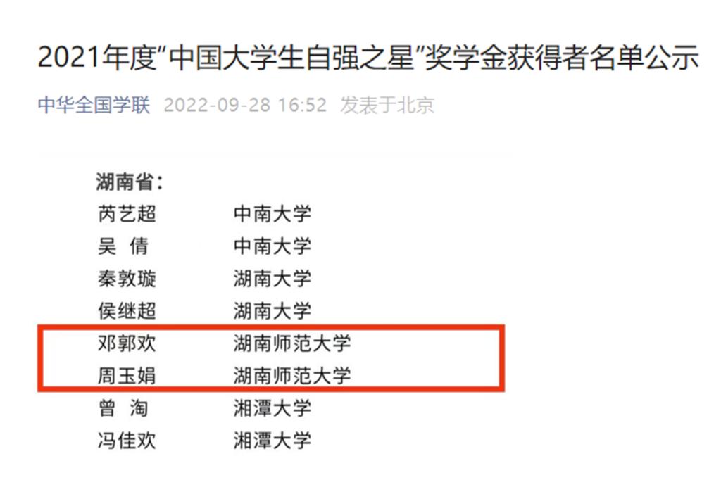 (通讯员 谢朵 熊法权 李晨瑜)9月28日,2021年度“中国大学生自强之星”奖学金获得者名单正式公布,我校文学院汉语言文学专业2018级本科生邓郭欢、外国语学院外国语言文学专业2020级研究生周玉娟入选。