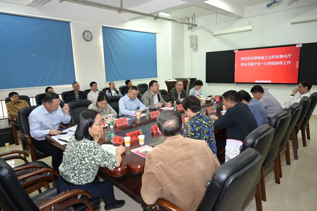 (记者 李睿 罗嘉卿)10月20日下午,湖南省工业和信息化厅副厅长张治平、二级巡视员吴毅龙一行来我校化学化工学院,调研我校在化工新材料领域的科技创新、成果转化、人才培养及产学研合作情况。副校长谢资清出席调研汇报会,会议由化学化工学院院长杨荣华主持。