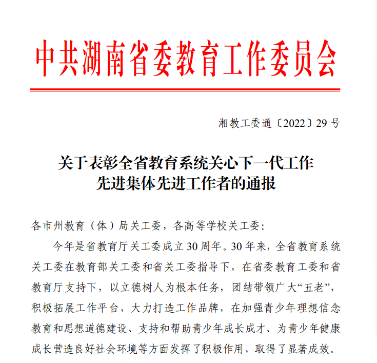 多年来,校关工委在学校党委、行政的领导下,坚持“党建带关建”,以“立德树人”为根本目标,助力青少年健康成长为价值取向,创新工作方式,积极参与学校“三全育人”思政工作,积极搭建关爱育人平台,带领广大“五老”发挥优势作用,在大、中、小、幼学生群体中围绕弘扬爱国主义、坚定理想信念、树牢社会主义核心价值观等主题教育活动,育人成果丰硕,多次受到上级部门的表彰。校关工委曾荣获中国关心下一代工作先进集体、全国教育系统关心下一代工作先进集体、湖南省关心下一代工作创新奖,教育部关工委“读懂中国”主题教育活动优秀组织奖。