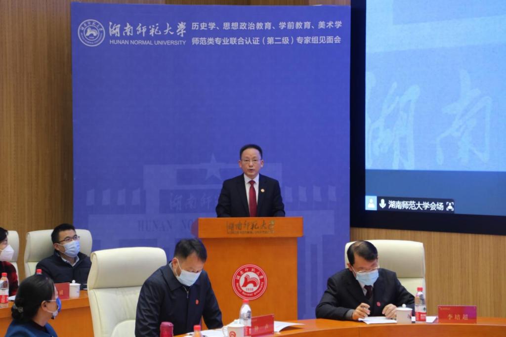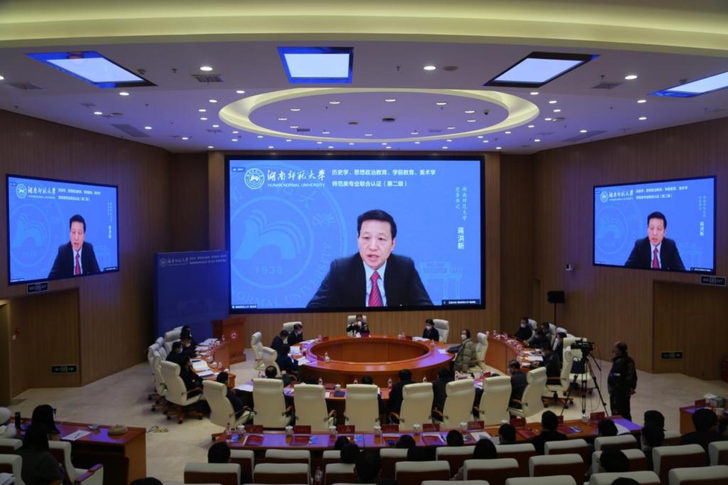 (记者 马铁泉 刘茵)近日,受湖南省教育厅、重庆市教育评估院的委派,以南京师范大学原副校长傅康生教授为组长的联合认证专家组一行24人,对我校历史学、思想政治教育、学前教育以及美术学专业开展师范类专业第二级联合认证线上考查。专家组全体成员、省教育厅教师工作与师范教育处副处长缪高勇,我校党委书记蒋洪新、副书记周俊武,副校长唐贤清、王辉、刘子兰等出席相关活动。