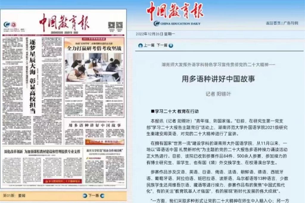 (记者 刘星辰)12月26日,中国教育报报道我校外国语学院发挥外语学科特色学习宣传贯彻党的二十大精神的特色做法。