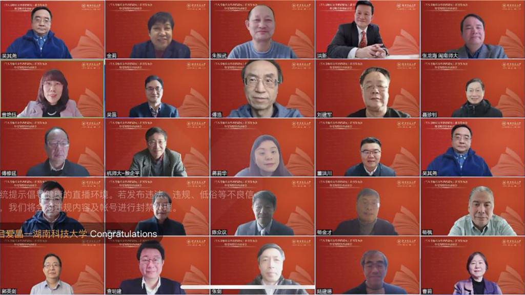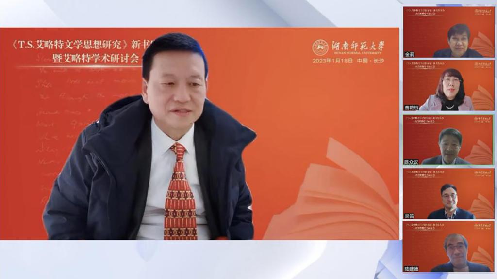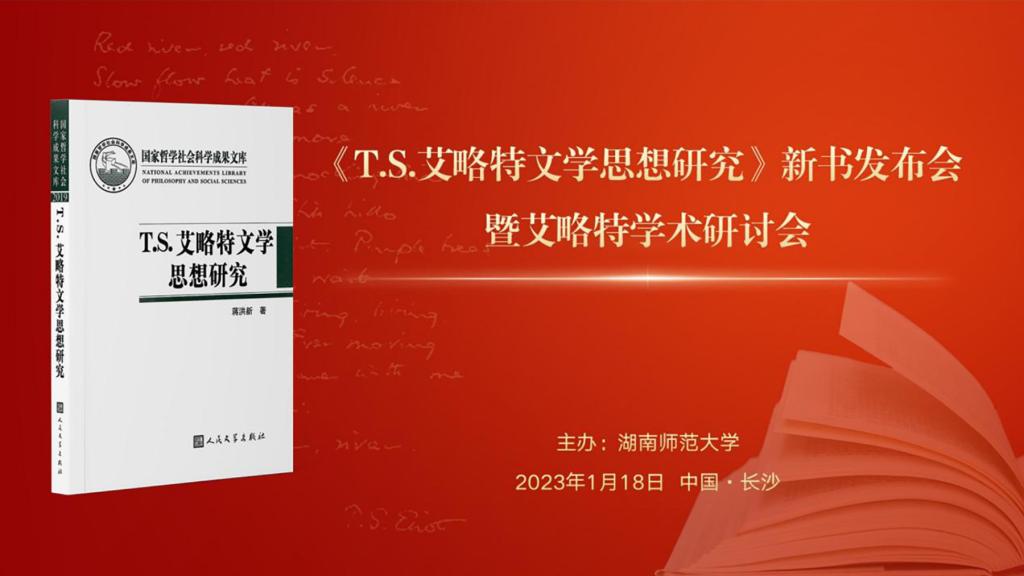 (供稿 外国语学院)1月18日,欧洲科学院院士、我校党委书记蒋洪新教授撰写的《T.S.艾略特文学思想研究》新书发布会暨艾略特学术研讨会在云端举行。会议邀请到来自中国社会科学院、清华大学、中国人民大学、北京外国语大学、上海外国语大学、浙江大学、南京大学、厦门大学、上海交通大学、四川外国语大学、广东外语外贸大学、江西师范大学、浙江工商大学、闽南师范大学、上海师范大学、杭州师范大学等高校的专家学者代表出席并座谈,共话艾略特研究。活动分为新书发布会和学术研讨会两部分,分别由北京外国语大学王佐良外国文学高等研究院院长金莉教授、我校外国语学院院长曾艳钰教授主持。
