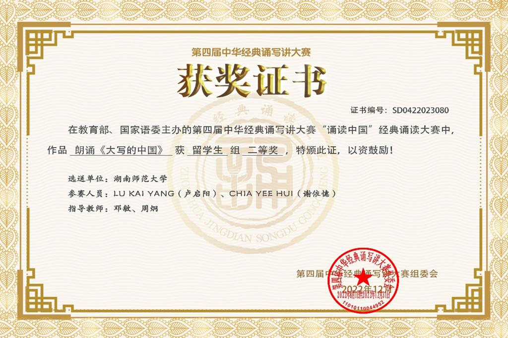 (供稿 国际交流合作处)近日,由教育部、国家语委主办的第四届中华经典诵写讲大赛“诵读中国”经典诵读大赛总决赛圆满落下帷幕。我校国际汉语文化学院2022级马来西亚留学生研究生卢启阳(指导教师:邓敏)、谢依憓(指导教师:周炯)朗诵的参赛作品《大写的中国》荣获留学生组全国二等奖。