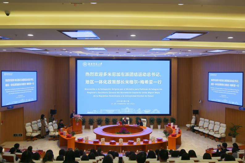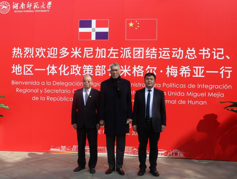 (通讯员 郑伊桐 廖阿琼 记者 李昕萌 肖晔)2月27日下午,多米尼加左派团结运动总书记、地区一体化政策部长米格尔·梅希亚一行5人来我校访问。中联部五局柯干副处长及随行人员,中共湖南省委外事工作委员会办公室副主任杨琦及随行人员等陪同。我校党委副书记周俊武出席会谈并致辞。会谈由我校国际交流合作处副处长李苗主持。