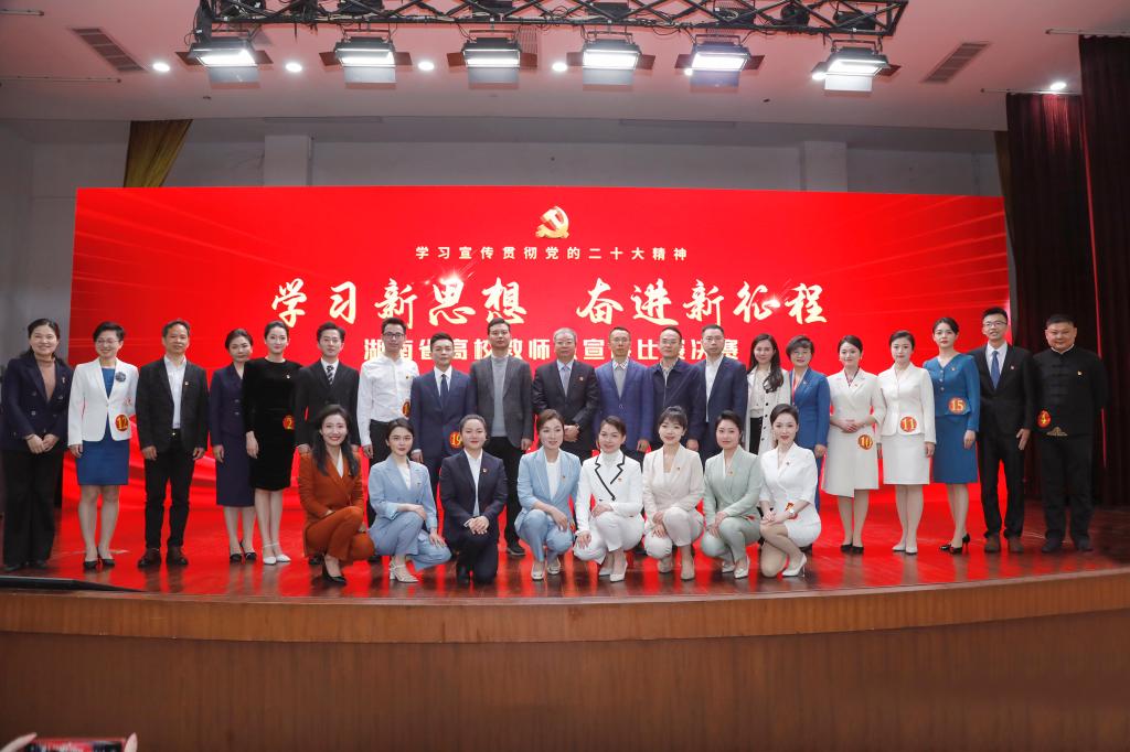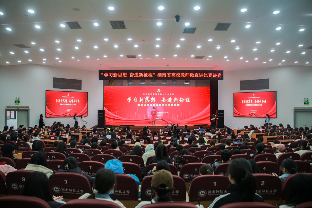 本届大赛由中共湖南省委教育工委、湖南省教育厅主办,我校承办,湖南教育电视台协办。通过各高校组织的初赛、省委教育工委和省教育厅组织的复赛,20名高校教师从全省100多所高校中脱颖而出,进入决赛。比赛现场,选手们紧紧围绕“学习新思想 奋进新征程”主题,讲道理、谈体悟、话初心、述理想,深情礼赞二十大,踔厉奋发新征程,用富有张力的语言、饱含情感的诉说、形式多样的才艺,激发思想共鸣,汇聚精神力量,选手们的表现赢得了现场评委和观众的阵阵掌声。