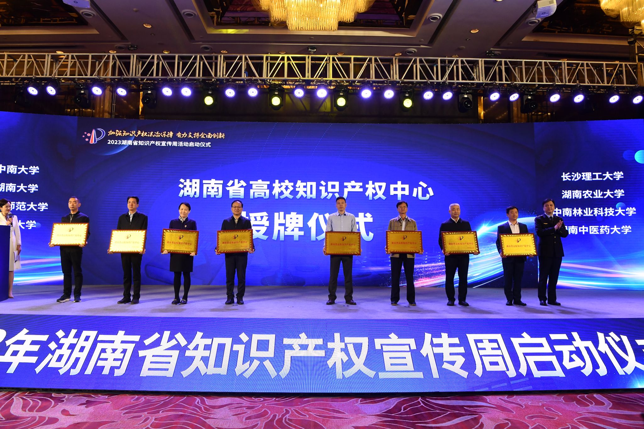 (供稿 科技处)4月23日,2023年湖南省知识产权宣传周启动仪式在长沙举行,我校副校长谢资清出席启动仪式,并代表学校接受湖南省高校知识产权中心授牌。