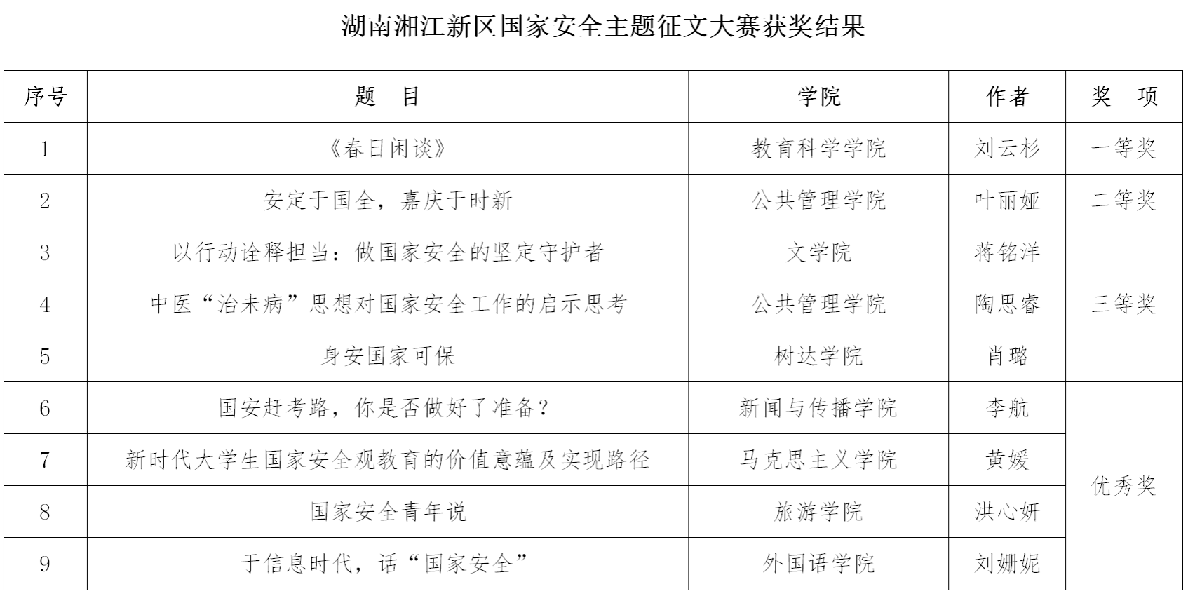 (通讯员 曹玥)近日,湘江新区公布了国家安全主题征文大赛评选结果,我校学子获得一等奖1项、二等奖1项、三等奖3项及优秀奖4项,学校获评优秀组织奖。