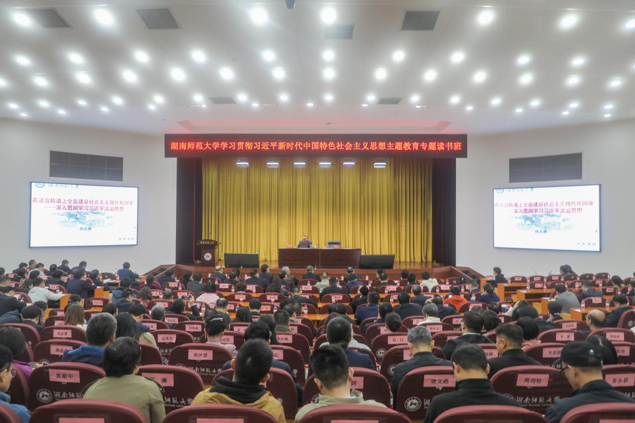 肖北庚聚焦马克思主义法治理论中国化,以详实的案例和扎实的理论功底,从“全面依法治国是全面建设社会主义现代化国家的重要内容和根本保障”“坚持党对全面依法治国的领导”“完善以宪法为核心的中国特色社会主义法治体系”“扎实推进依法行政”“加快建设公正权威的社会主义司法制度”“加快建设法治社会”等六个方面进行宣讲,并详细阐释了习近平法治思想的形成过程、主要内涵和重大意义。他表示,“法治兴则国家兴,法治衰则国家乱”,走向法治是人类社会演进的一般规律,是中国共产党执政实践得出来的经验和结论,是实现国家治理体系和治理能力现代化的重要依托。他以两会期间举行宪法宣誓仪式和修改《立法法》为例,表明中国特色社会主义法治思想在实践中显示出强大生命力和巨大优越性,充分体现了尊崇宪法、维护宪法、恪守宪法的高度政治自觉和鲜明法治精神。他强调,领导干部要发挥带头示范作用,弘扬社会主义法治精神,传承中华优秀传统法律文化,引导全校师生做社会主义法治的忠实崇拜者、自觉遵守者、坚定捍卫者,让尊法守法用法在全社会蔚然成风。